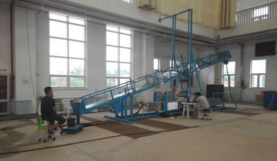 (深0.5m宽0.63m长11m可变坡度试验槽及其对应人工降雨系统,可变坡度范围为0-30°。)