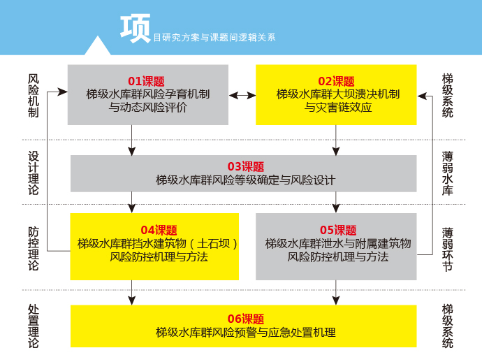项目共设6个课题:(1)梯级水库群风险孕育机制与动态风险评价;(2)梯级水库群大坝溃决机制与灾害链效应;(3)梯级水库群风险等级确定与风险设计;(4)梯级水库群挡水建筑物(土石坝)风险防控机理与方法;(5)梯级水库群泄水与附属建筑物风险防控机理与方法;(6)梯级水库群风险预警与应急处置机理。