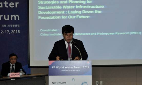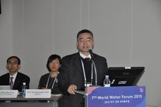 贾金生教高作为第七届世界水论坛国际指导委员会成员,参加了论坛期间举行的水论坛纪念中心落成仪式,并作为联合主持人或专家组成员,参加了联合国可持续发展目标的储水基础设施、水-能源-粮食纽带关系等分会报告。