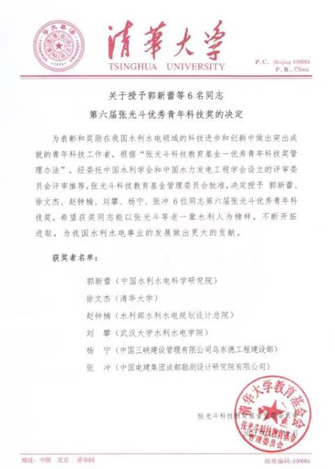 张光斗优秀青年科技奖设立于2009年,旨在表彰和奖励在我国水利水电领域的科技进步和创新中做出突出贡献的青年科技工作者。本奖项每2年评审一次,每次评选6名,分别由中国水利学会和中国水力发电学会设立的评审委员会评审推荐,张光斗科技教育基金管理委员会批准。第六届张光斗优秀青年科技奖的六位获奖者分别为郭新蕾、徐文杰、赵钟楠、刘攀、杨宁、张冲。